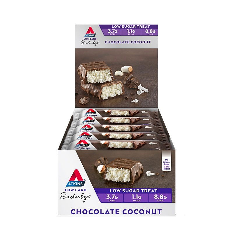 | Atkins Endulge Chocolate Coconut Bar The Atkins Endulge Chocolate Coconut Bar is designed to taste exactly like your favourite chocolatey snack. Moist, creamy coconut is covered in a delicious chocolate coating to satisfy cravings for sweet treats between healthy meals. Endulge, Atkins’ low sugar range, gives you tasty alternatives to regular snacks, helping you maintain a healthy, low carb lifestyle and avoid post-snacking sugar crashes. Atkins Endulge bars are designed to complement a low carb, low sugar lifestyle, as snacks to fill you up between meals. |