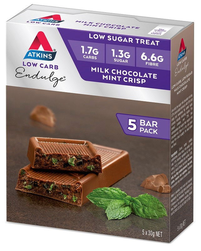 Atkins Endulge Milk Chocolate Mint Crisp Bar - Perfect for all you chocolate mint lovers. Made with crunchy mint crisps and surrounded by creamy milk chocolate, this bar is the perfect low sugar treat!