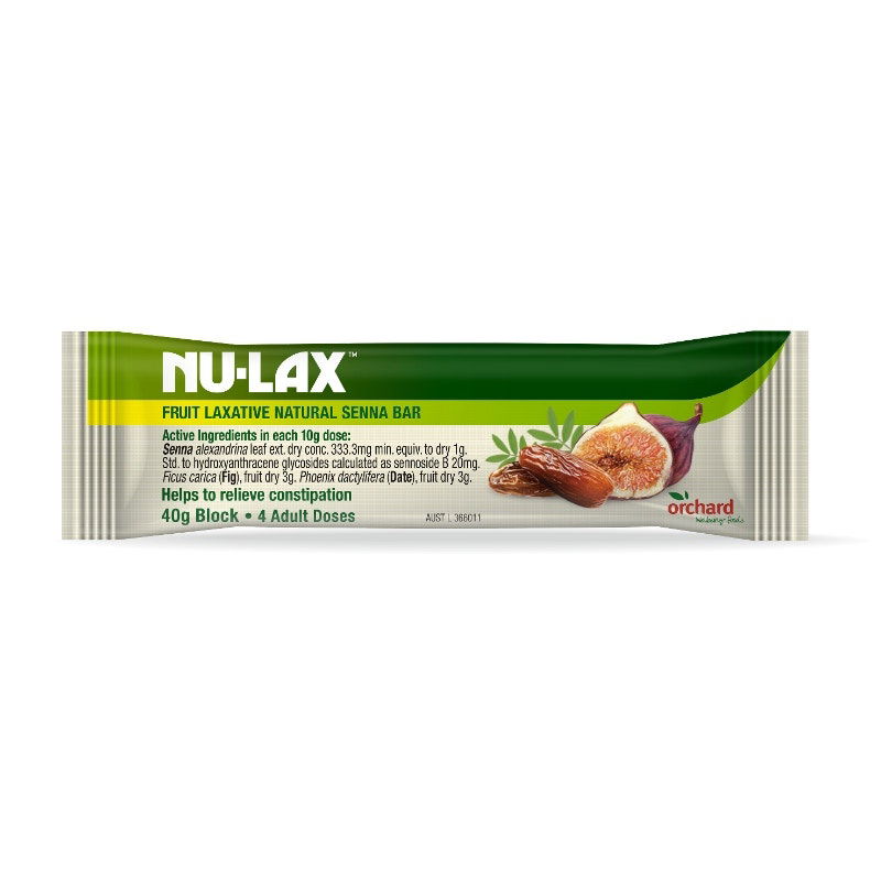 Nu-Lax fruit laxative bar is a convenient way to take laxative on the run. Each 40g bar contains 4 doses with the outer packaging marking each single dose (10g)