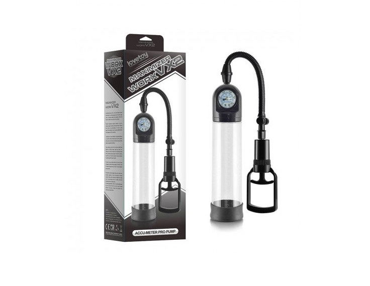 Maximizer worx VX2-ACCU-METER PRO PUMP Consists of a vacuum chamber trigger pump, a removable airtight silicone seal and a Bonus penis ring. Measuring 2.68 inches wide 11 inches in total length and accommodating 7.8 inches in penis length.