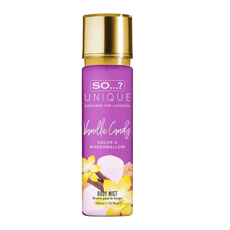 Our So…? Unique Vanilla Candy Body Mist 150ml teases your senses with sugary notes of marshmallow and sweet vanilla, before progressing into a refreshing melange of peach and pineapple.