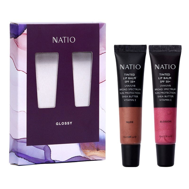Glossy gift set contains 2 x full sized Tinted Lip Balm SPF 50+ in shades Blossom and Nude, ready to gift in a Natio presentation box.