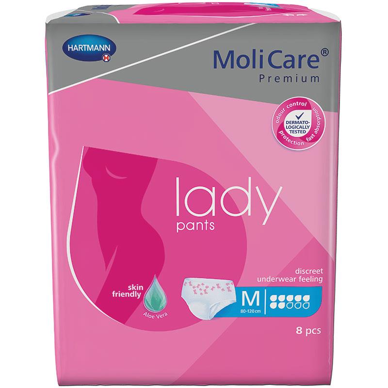 MoliCare Premium lady pants look and feel like regular underwear and are ideal for light to moderate levels of bladder weakness. The pants contain skin-friendly Aloe Vera as well as a 3-layer absorbent core that pulls fluid away from the surface, so the skin stays dry, healthy and free from odours. It also has unique curly fibre technology that helps to maintain the skin's natural pH level and is important in reducing infection and skin irritation caused by incontinence.