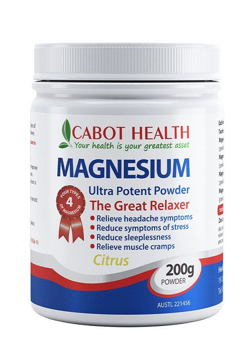 Cabot Health Magnesium Ultra Potent Powder contains 4 different types of magnesium in powder form for quick and efficient absorption.