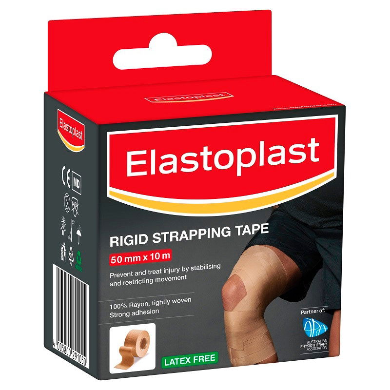 Elastoplast Rigid Strapping Tape 50mm x 10m prevent and treat injury by stabilising and restricting movement. 100% rayon, tightly woven. Strong adhesion. Latex free.