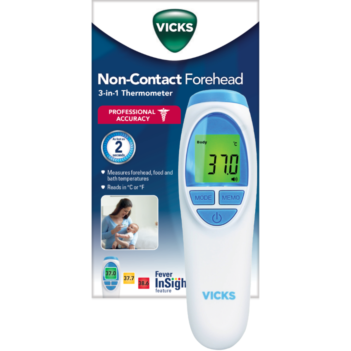 The Vicks Non-Contact 3-in-1 Forehead Thermometer minimises the struggle or stress of temperature taking with 2 second accurate forehead readings.