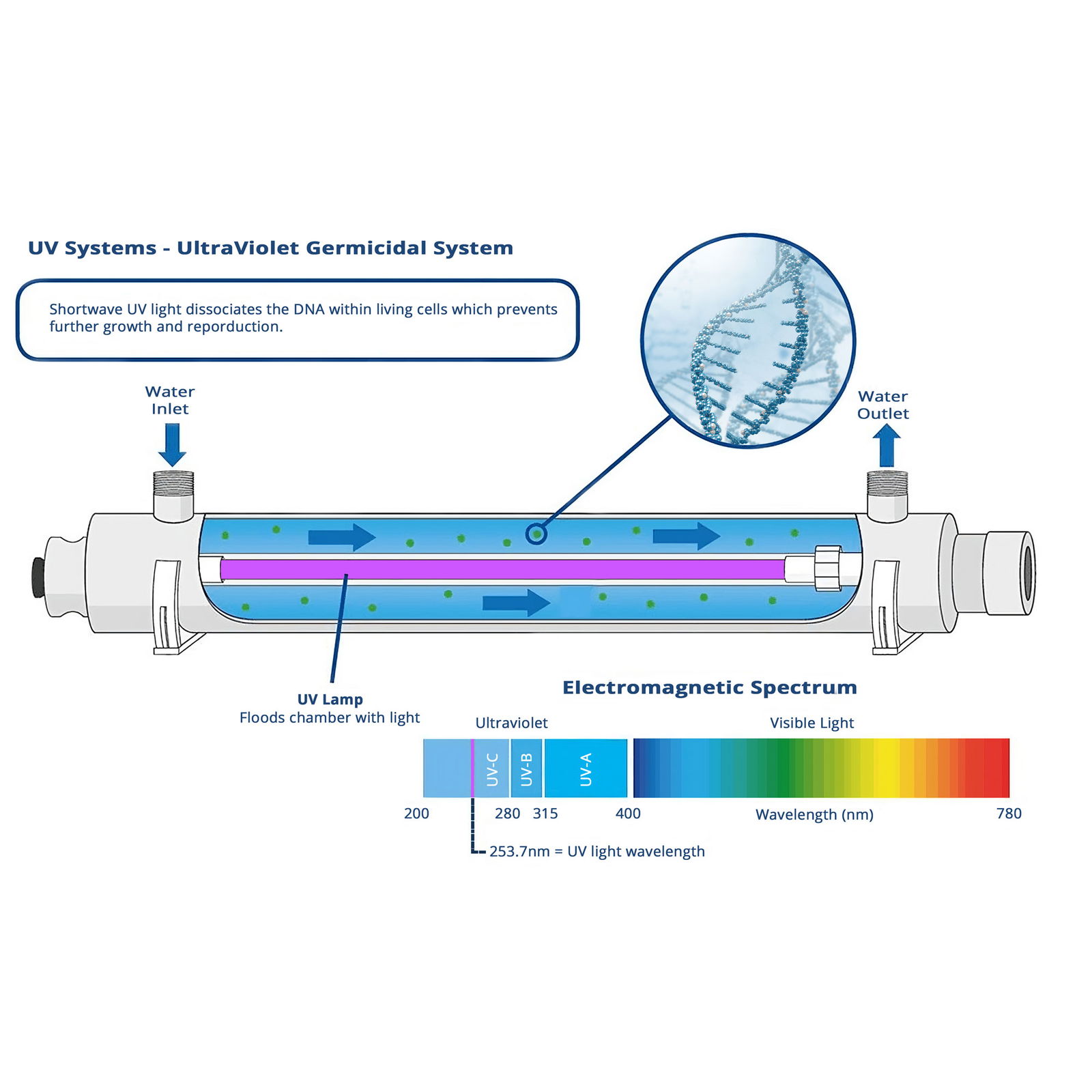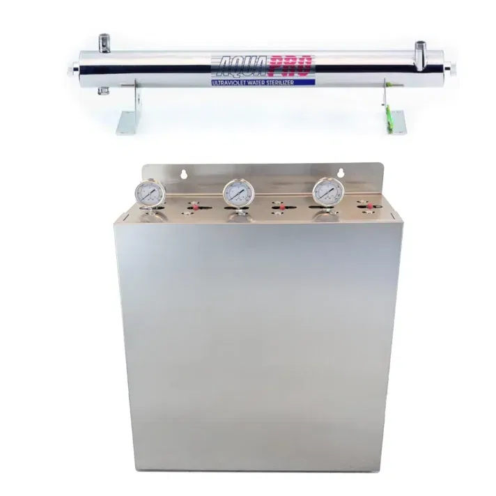 UV Sterilizer (39W, 45 L/min, stainless steel): Kills bacteria, viruses, and protozoa without chemicals