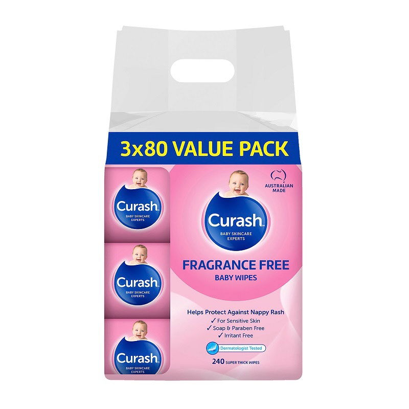 Curash Babycare Fragrance Free Baby Wipes gently cleanse baby’s skin and remove residue that can cause nappy rash. Value Pack contains 3x80s packs or 240 wipes.