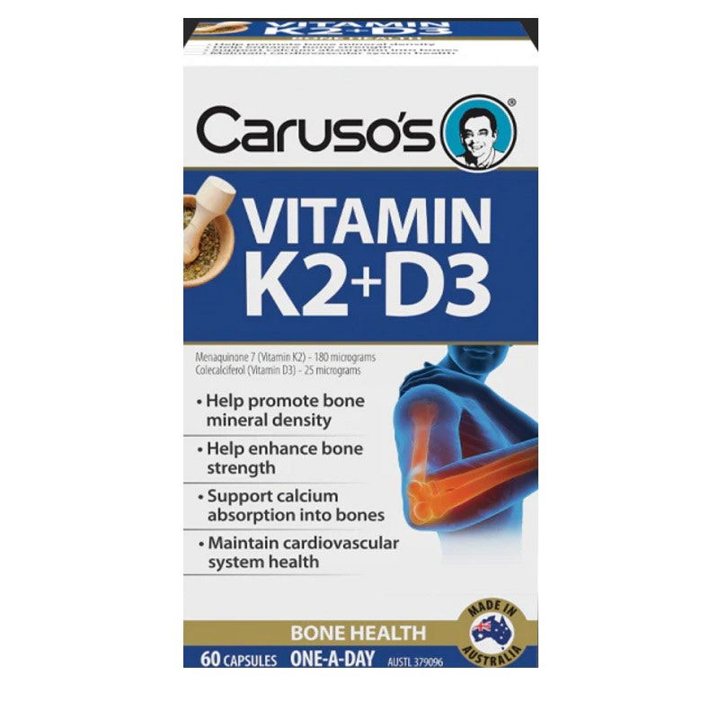 Caruso's Vitamin K2+D3 is a special vitamin combination formulated to help maintain strong and healthy bones. Vitamins D3 and K2 promote bone mineralisation by supporting calcium absorption in the bones and increasing calcium bone metabolism.