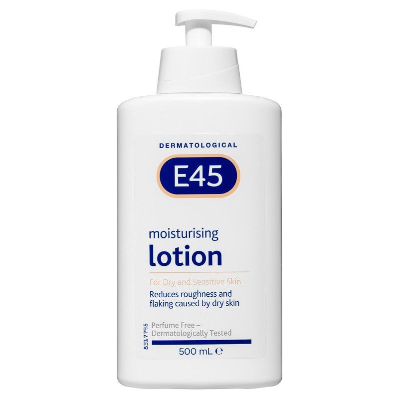 E45 Moisturising Lotion reduces roughness and flaking caused by dry skin.