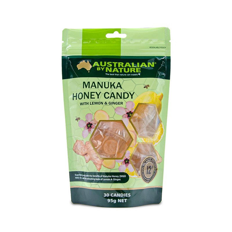 Australian by Nature Manuka Honey Candy with Lemon & Ginger are a refreshing and tasty treat. With the soothing effect of Manuka Honey 12+ Methyglyoxal (MGO 400), zesty fruit flavour of Lemon and spicy delicious herb flavour of ginger these candies are effective in soothing your throat and giving freshness to your breath.