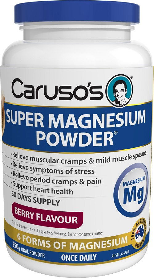 Caruso’s Super Magnesium Powder is a high potency magnesium powder formula containing six forms of magnesium and vital cofactors for enhanced utilisation. Caruso's Super Magnesium Powder now comes in a delicious Forest Berry flavour.