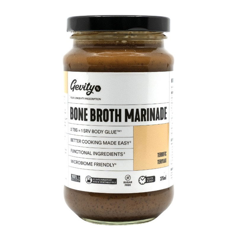 Introducing a no-sugar, delicious Teriyaki marinade with endless possibilities! Unlike regular Teriyaki, the Gevity Rx version contains NO soy, sugar, wheat or additives of any kind! Instead it’s made with Organic Coconut Aminos, Sweet Guts their very own prebiotic sweetener) and of course Body Glue.