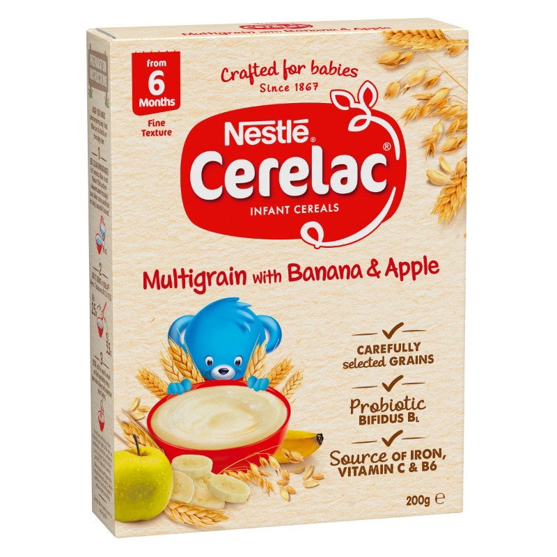 Nestle CERELAC Multigrain with Banana and Apple is a nutritious baby cereal made with real fruit and mixed grains (Oats, Wheat, Corn, Barley, Rye & Spelt) introducing your baby to even more exciting new tastes and textures as they transition into baby food.