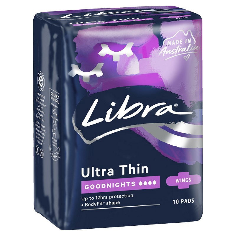 Libra Ultra Thins Goodnights with unique contoured wings, plus BodyFit® shape that moves with you, so your pad fits better and stays put while you sleep. Extra length for extra coverage.