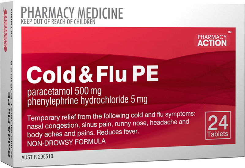 Pharmacy Action Cold & Flu PE Tablets have a non-drowsy formula for temporary relief from the following cold and flu symptoms: