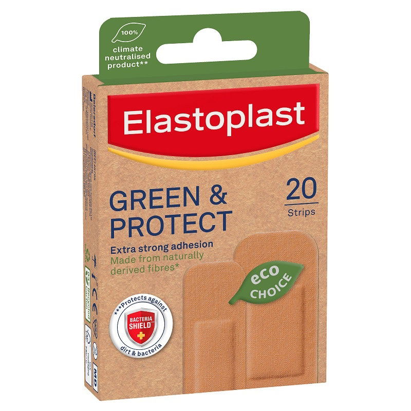 Get sustainable protection from Elastoplast with Green & Protect wound plasters - covers and protects minor wounds. The wound pad and backing are made from naturally derived fibres*, the product is 100% climate neutralised** and the packing is a 93% recycled carton. It's the Eco Choice wound protection