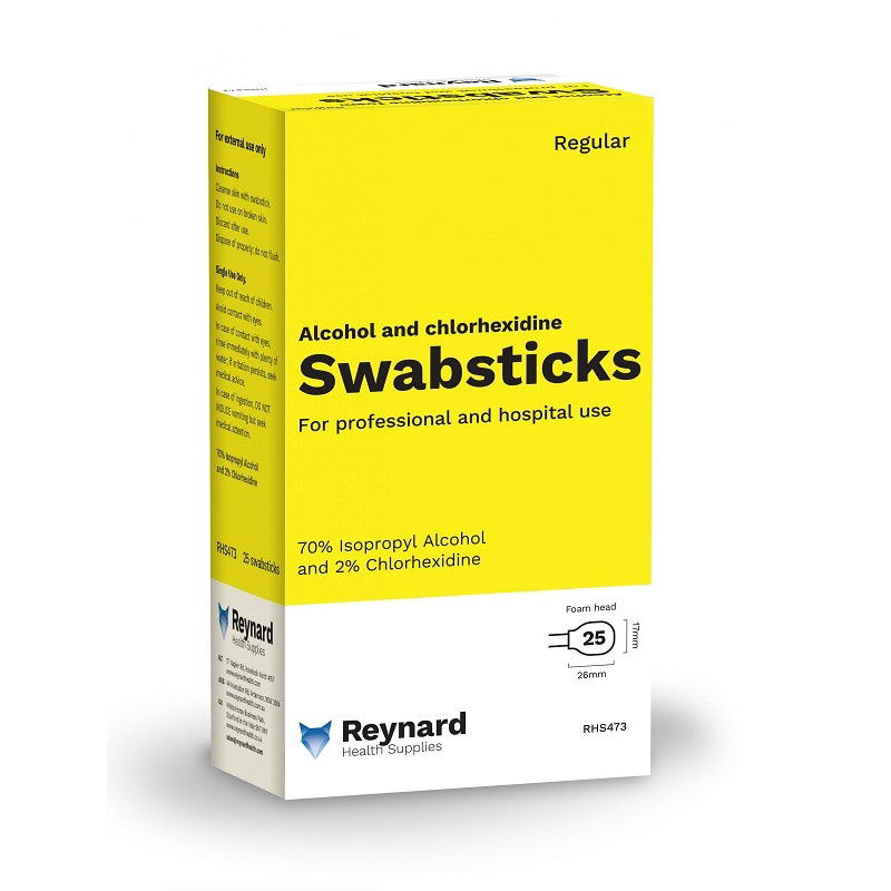 Reynard Foam Swab Sticks are a wetted pad adhered to a plastic stick which is used to sanitise the skin. They contain 70% Alcohol and 2% Chlorhexidine.