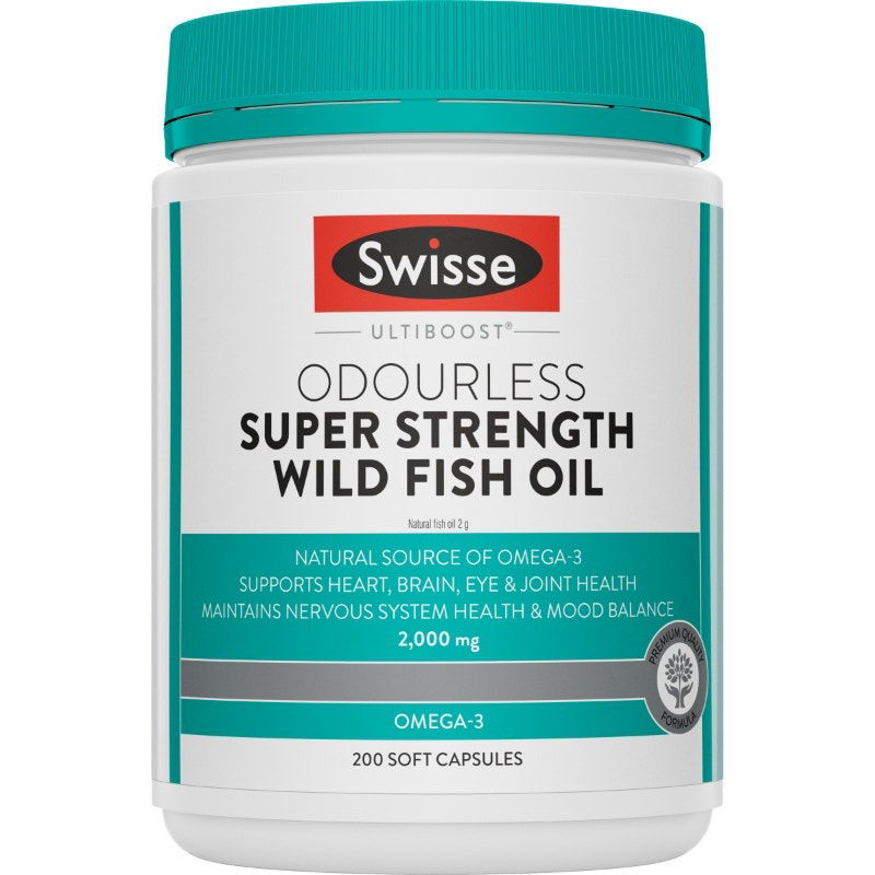 Swisse Ultiboost Odourless Super Strength Wild Fish Oil is your daily support with 2 g of fish oil in each capsule, rich in EPA and DHA. The omega 3 fatty acids support your heart health and with DHA you're supporting your brain and your nervous system health. At a higher dose of three capsules, embrace fish oil to support a healthy, balanced mood. Our formula is sustainably sourced formula to ensure you get the essential omega-3 fatty acids without the fishy smell.