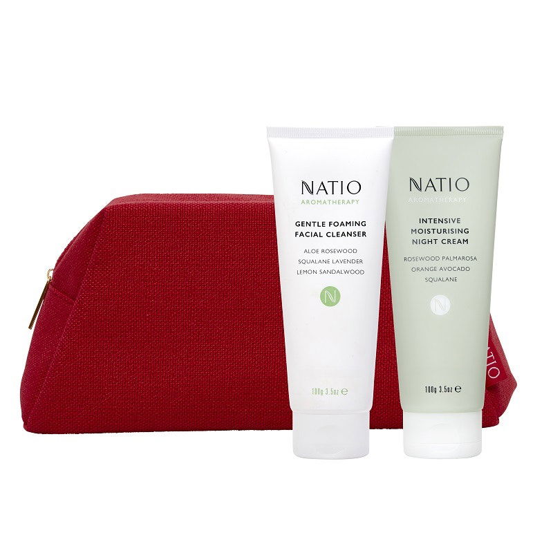 Care gift set contains a full size Aromatherapy Gentle Foaming Facial Cleanser and Intensive Moisturising Night Cream, presented in a complimentary Natio cosmetic bag.