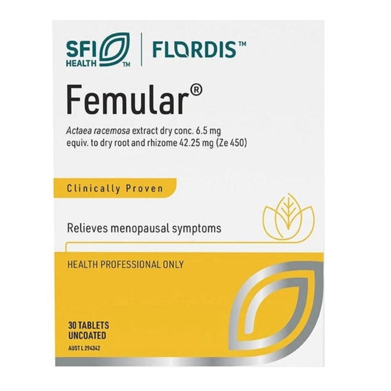 Femular contains a clinically proven extract of Actaea racemosa referred to as Ze 450. This exclusive formula has been extensively researched to relieve menopausal symptoms including hot flushes, night sweats, disturbed sleep, fatigue, irritability and mild anxiety. With its easy once daily dose, Femular provides relief during all stages of menopause. Additionally, at the 13 mg dose (2 tablets), Femular has been shown to relieve menopausal symptoms such as temporary feelings of sadness, joint pain, and headache.