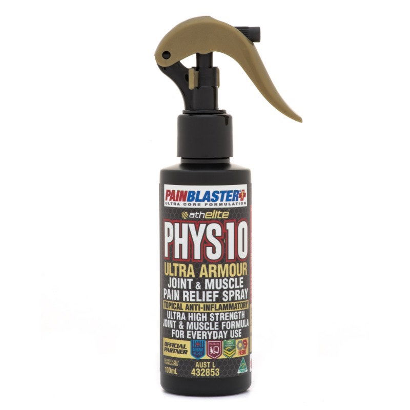 Joint & Muscle Pain Relief Spray. PHYS10 Ultra Armour high strength Joint & Muscle formula optimised for sports and everyday use. Topical Anti-Inflammatory. Athelite's active ingredients are traditionally used in western herbal medicine for the relief of - symptoms of mild arthritis, bruising, mild joint pain and inflammation, muscle pain and inflammation, muscle sprains, strains & soreness.