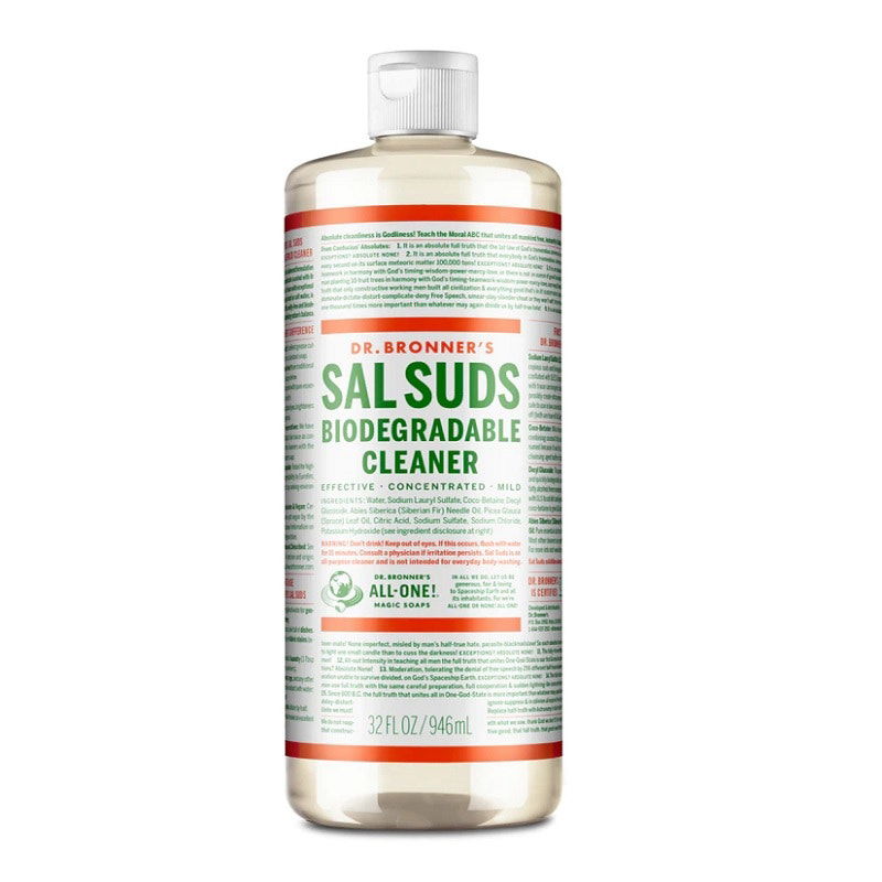 Dr. Bronner's Sal Suds Liquid Cleaner is not a soap but instead is a concentrated hard-surface all-purpose cleaner. It is made with plant-based surfactants and natural fir needle and spruce essential oils (no cheap, harsh pine stump oil), without any synthetic dyes, fragrances or preservatives. Perfect for general household cleaning (dishes, floors, laundry, etc.), it cleans and rinses with exceptional power, yet it is mild and gentle on the skin. Sal Suds Liquid Cleaner is equally effective in hard or soft water, rinsing freely, hot or cold. It is 100% cruelty-free, as certified by the Coalition for Consumer Information on Cosmetics, and it will biodegrade rapidly after doing its job.