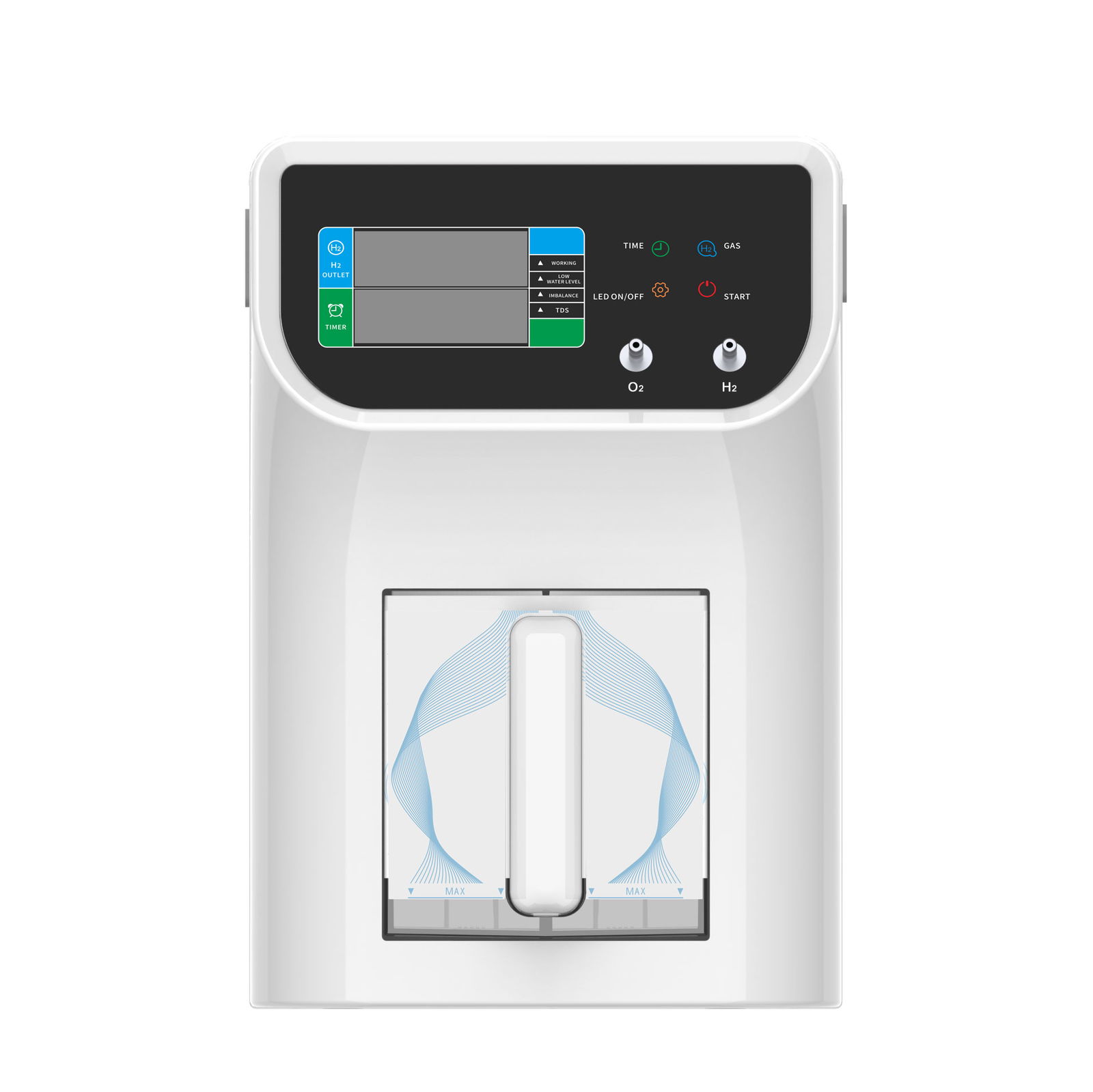 Up to 1000 ml/min of 99.9% pure hydrogen (H2) or up to 1500 ml/min of Oxyhydrogen gas (H2+ O2)