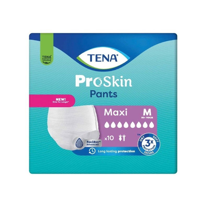 Tena Pants Maxi are white, soft and comfortable, disposable incontinence pants for men and women with pull up fit just like regular underwear. With a close body-fit and textile like, breathable materials they are designed for soft comfort. Unlike standard adult diapers, Tena Pants Maxi have a core with maximum absorbency that quickly and effectively locks in liquid for total security. When worn, the thin and flexible core shape forms two absorption channels, also known as the Dual Absorption Zone, that efficiently channel moisture away from the body for optimum dryness and protection. Integrated leakage barriers provide additional security. Reliable protection against leakage for an active lifestyle and confidence, no matter the situation.