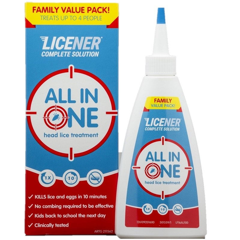 Licener complete solution gets rid of head lice quickly and easily. Kills both head lice and eggs in one easy 10 minute treatment. The clinically tested shampoo requires no combing to be effective, is gentle on normal skin and hair, does not sting and has little odour.