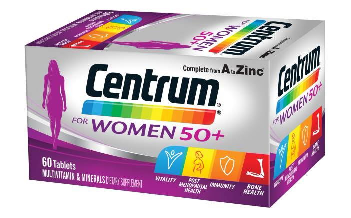 Centrum For Women 50+ is focused on more nutritional support specifically addressing bone health, post menopausal health, mental performance and immunity. Increased levels• of Vitamin D, Calcium and Iron to support healthy bones, and post menopausal health and Zinc to help support mental performance, and extra• vitamin C for immunity.