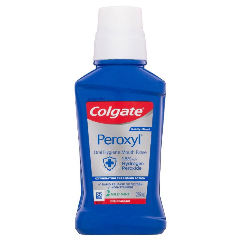 Colgate Peroxyl Oral Hygiene Mouth Rinse is a ready-mixed, non-staining, mint flavoured oral cleanser.