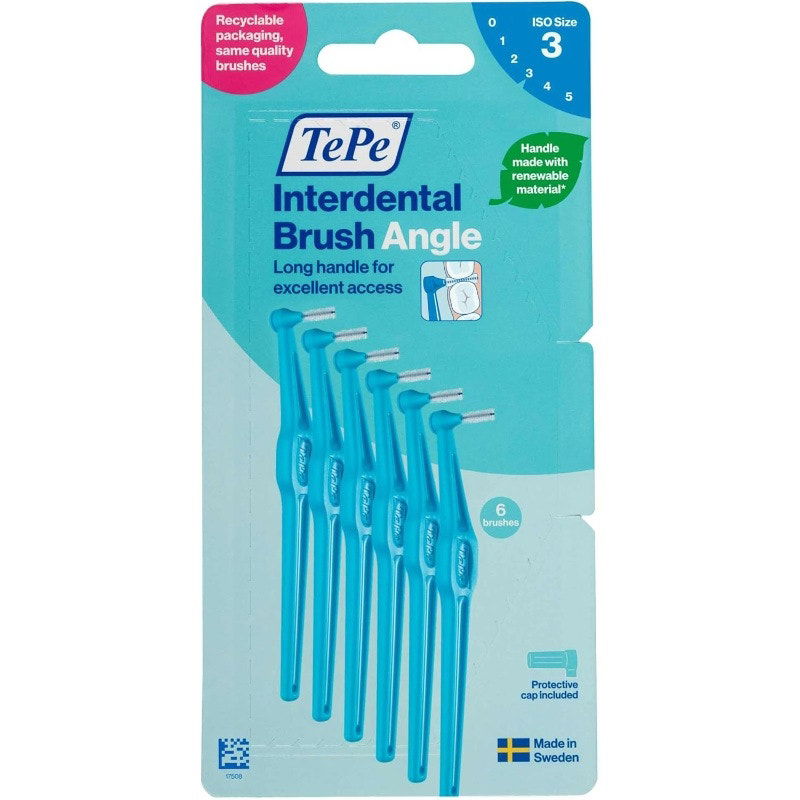 An interdental brush is the most efficient, user-friendly device for plaque removal between teeth. TePe Angle is designed to clean the gaps between the teeth, where a regular toothbrush is unable to reach. The Angle interdental brush has a long handle and an angled head for easier access between the back teeth. Use daily to keep gums and teeth healthy and fresh.