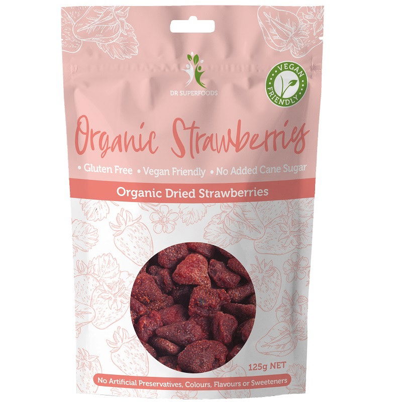 Dr Superfoods organic dried strawberries are 100% natural and contain no artificial preservatives, colours or flavours, and no added sugar.