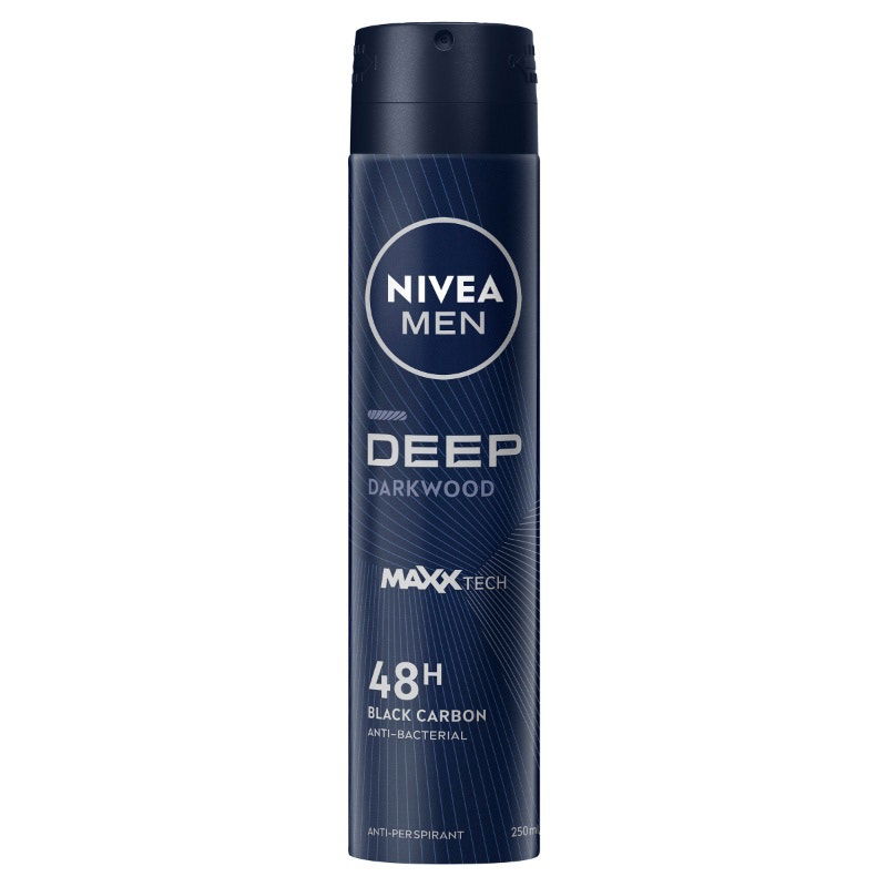 NIVEA MEN Deep Darkwood Anti-Perspirant Aerosol Deodorant protects your skin from sweat and bacteria for a long-lasting dryness and a clean skin feel, as if you’ve just stepped out of the shower. The effective anti-bacterial formula with black carbon and MAXXTECH, works without leaving any black residue and is complemented by a modern and masculine Darkwood fragrance. Reliable 48 hour protection so you can feel fresher for longer. Get the reliable protection and care that you deserve! The skin tolerance of this anti-perspirant has been dermatologically proven.