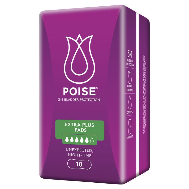Poise Extra Plus Pads for Bladder Leaks offer discreet protection against heavy bladder leakage. Providing additional coverage to period pads, they absorb bladder leaks commonly experienced unexpected and overnight. Experience Poise 3 in 1 Bladder Protection to enjoy comfort, dryness and odour control. You've got Poise to keep you feeling feminine, confident and in control.