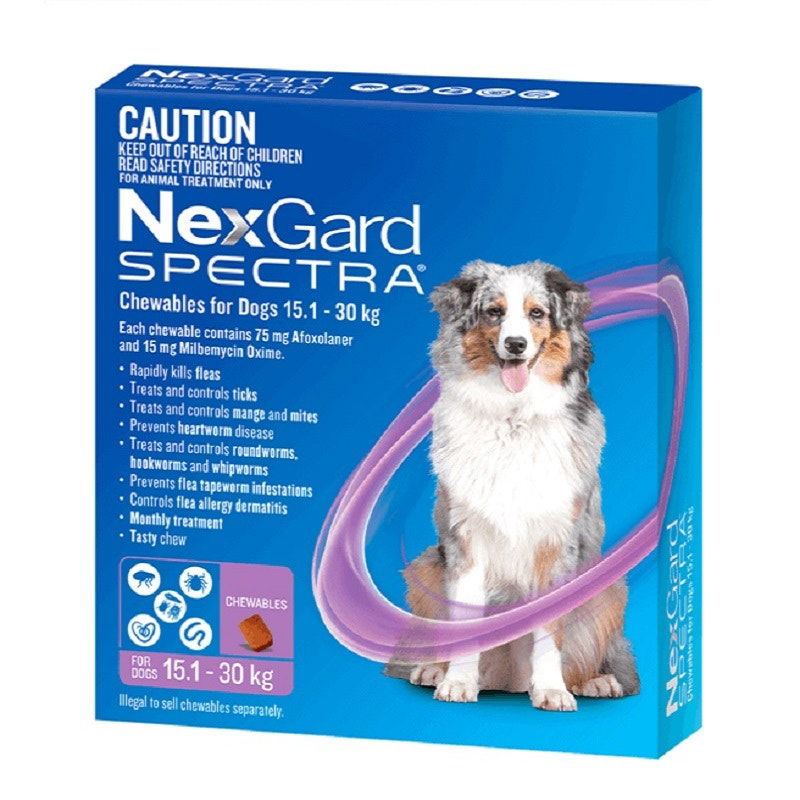 NexGard Spectra is a monthly treatment in the form of a beef flavoured chew which provides your dog with protection against most internal and external parasites of dogs in Australia.