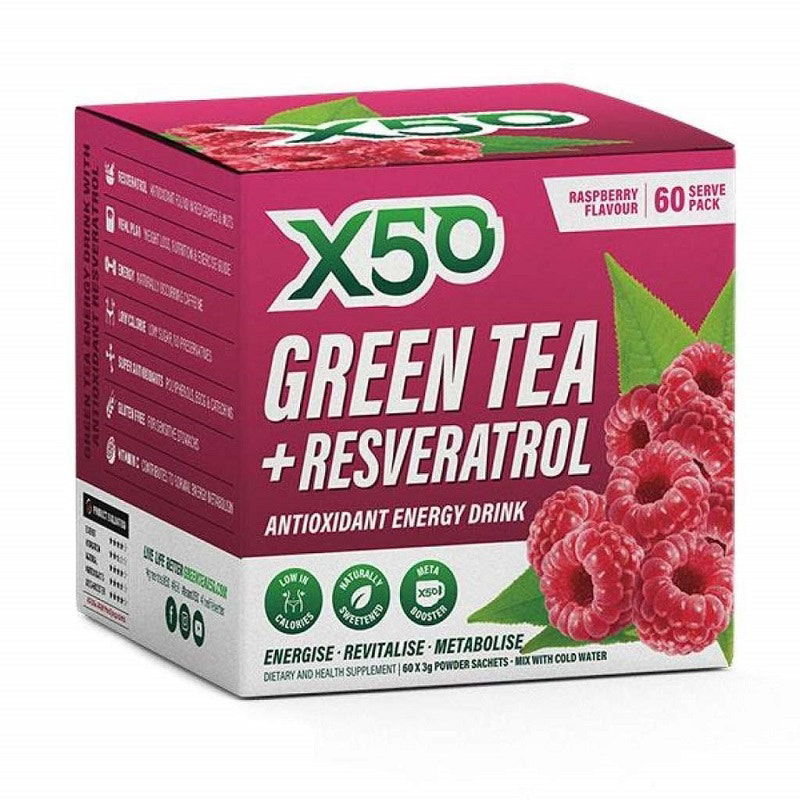 Green Tea X50 is a super blend of green tea extract and resveratrol, loaded with antioxidants and metabolism boosting ingredients, plus that nice clean energy X50 is known for… swap out fizzy drinks and increase your water intake everday with X50. The Raspberry flavour is an classic favourite and is sweet and delicious. You'll enjoy 60 serves in each pack along with receiving a Bonus Live Life Better Weight Goals Meal Plan and Programme.