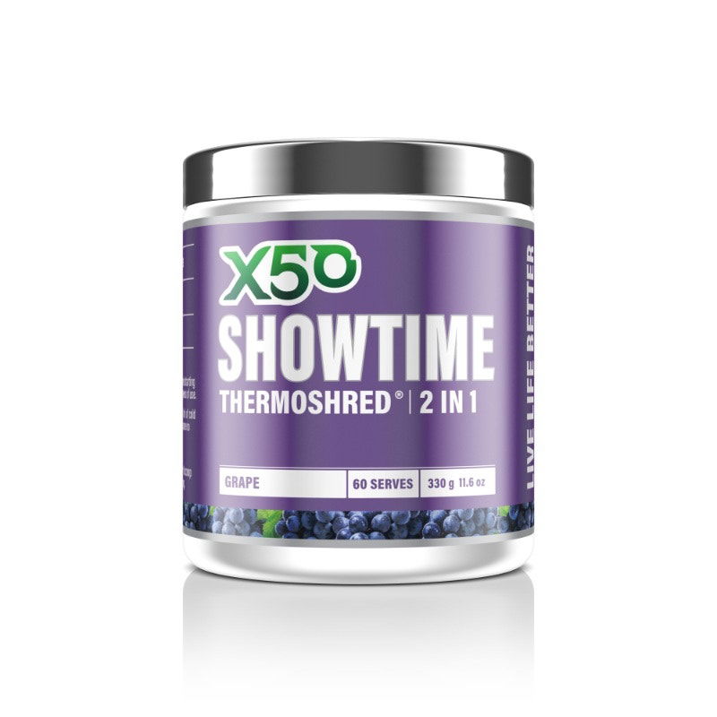 - THERMOSHRED Showtime is packed with 10 active fat burning ingredients to get your body firing.