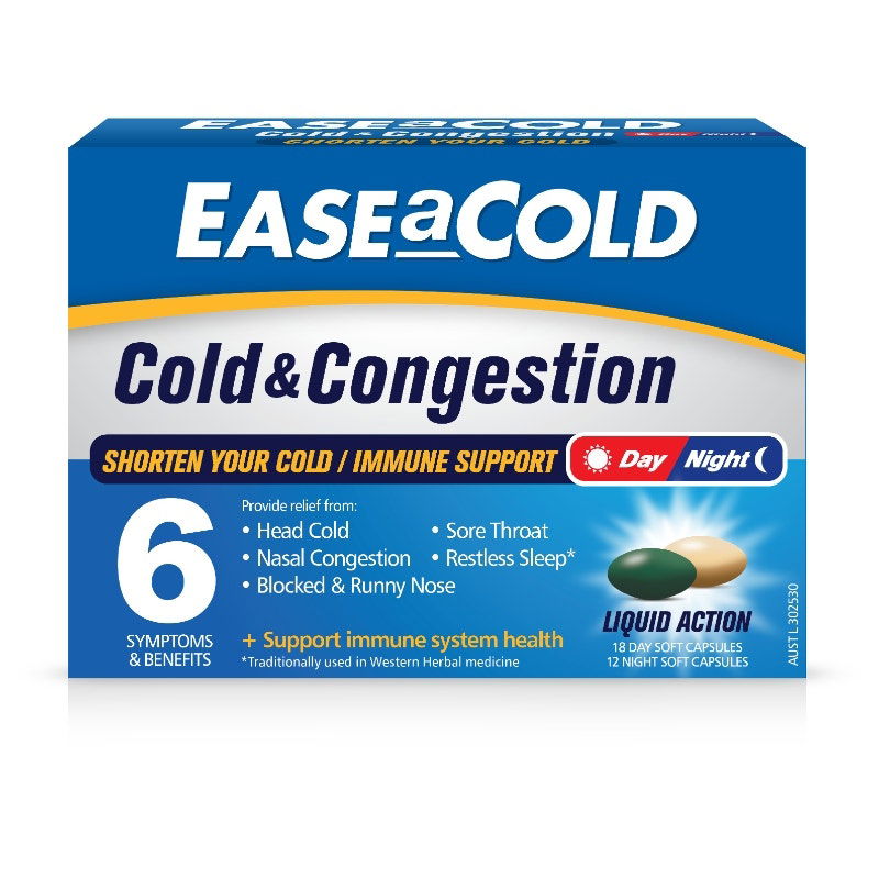 EASEaCOLD Cold & Congestion is specifically formulated to help reduce the severity and duration of cold symptoms including sore throat, nasal congestion, runny nose, and stimulate a healthy immune system response.