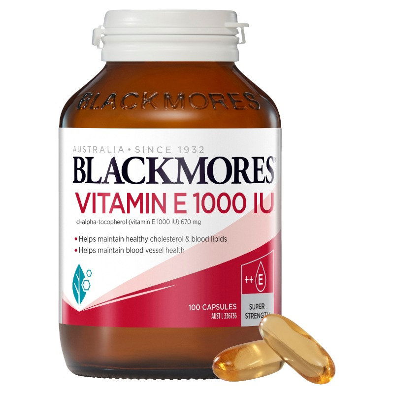 BLACKMORES VITAMIN E 1000 IU contains a super strength one-a-day dose of a vitamin E. An antioxidant that helps maintain healthy cholesterol & blood lipids and supports blood vessel health. Maintains vitamin E levels in the body and helps reduce free radical damage to body cells.